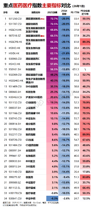 先来看下2025年回顾,更新了34只重点医药医疗指数的25年年度涨幅及四季度回撤情况。