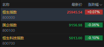 今日港股三大指数涨跌不一,恒生指数涨0.07%,报25945.54点,恒生科指跌0.10%,国企指数跌0.06%。盘面上,科网股涨跌不一,百度跌超1%,联想涨超0.5%;黄金股普涨,紫金矿业涨超2%;创新药概念部分上涨,博安生物涨超4%;内房股多数低开,万科跌超5%。
